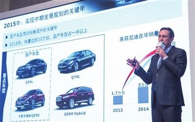 盡管去年成果豐碩,戴雷表示2015年對(duì)于英菲尼迪更為重要,因?yàn)榻衲晔怯⒎颇岬蠂?guó)產(chǎn)產(chǎn)品真正發(fā)力的一年。他深刻地認(rèn)識(shí)道,一個(gè)品牌要在中國(guó)真正長(zhǎng)期發(fā)展,本土化和國(guó)產(chǎn)勢(shì)在必行。戴雷說(shuō),國(guó)產(chǎn)**年非常關(guān)鍵,將為未來(lái)發(fā)展打好堅(jiān)實(shí)的基礎(chǔ)。英菲尼迪去年推出了Q50L轎車,今年3月份將推出QX50SUV,這兩款車都是專門為中國(guó)市場(chǎng)定制的。