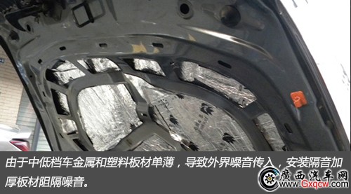 由于中低檔車金屬和塑料板材單薄,導(dǎo)致外界噪音傳入,安裝隔音加厚板材阻隔噪音。