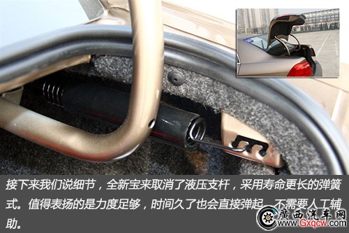 接下來我們說細節(jié),全新寶來取消了液壓支桿,采用壽命更長的彈簧式。值得表揚的是力度足夠,時間久了也會直接彈起,不需要人工輔助。