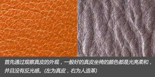 首先通過觀察真皮的外觀,一般好的真皮坐椅的顏色都是光亮柔和,并且沒有反光感。(左為真皮,右為人造革)