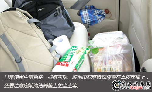 日常使用中避免將一些臟衣服、臟毛巾或臟籃球放置在真皮座椅上,還要注意定期清潔腳墊上的塵土等。
