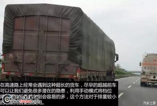 在高速公路行駛時,經常會遇到車身很長的重型貨車,這個時候如果 我們可以盡早的超越前車,可以避免很多隱患,大排量車 型(比如3.5-4.0L)此時如果深踩油門進行超越相對還容易一些,但小排量車型如果要快速超越這種大型貨車就會顯得底氣不足了,這時就可以利用手動模式降 低擋位后再超車。