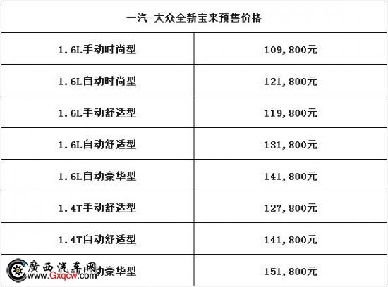 一汽-大眾全新寶來全系8款車型,預售價格如下: