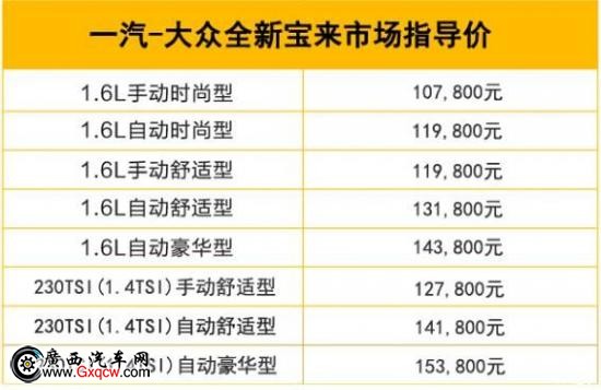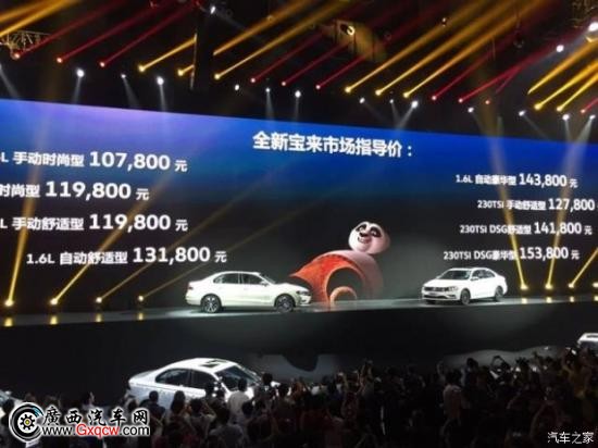 2016年3月20日,?,一汽-大眾全新寶來上市發(fā)布會(huì)在馮小剛電影公社隆重舉行,備受期待的全新寶來終于來了!上市發(fā)布會(huì)以“樂生活 趣改變”為主題,共推出1.6L和1.4TSI兩個(gè)排量共8款車型的市場指導(dǎo)價(jià),價(jià)格區(qū)間10.78-15.38萬元。