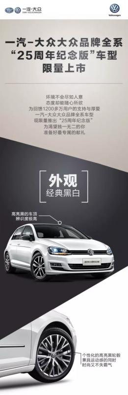 為慶祝一汽-大眾成立25周年,一汽-大眾攜全系車型集體推出了耀世25周年紀(jì)念版,細(xì)節(jié)之處展現(xiàn)睿智尊榮,歡迎到店蒞臨品鑒。