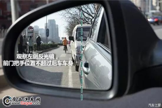 4、觀察左側(cè)反光鏡,左前門把手不突出后方車輛車身