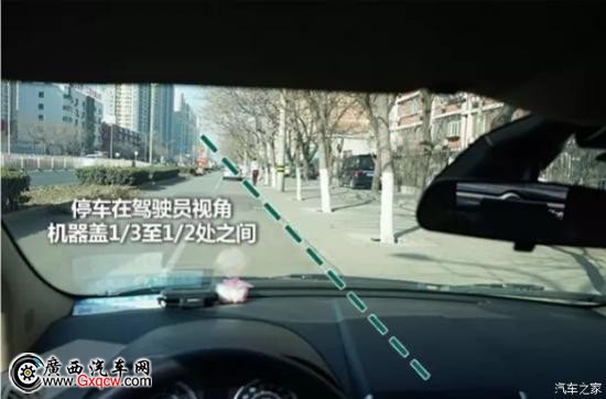 3、調(diào)整右側(cè)距離,直至車前把手將將遮住馬路邊緣