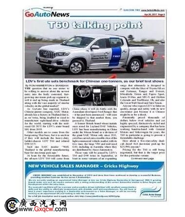 同時(shí),他對上汽大通T60也進(jìn)行深度報(bào)道。報(bào)道中寫到:“上汽大通T60與D90將于今年9月于澳洲發(fā)布,它們的出現(xiàn)將打破原有人們對中國制造的產(chǎn)品質(zhì)量、設(shè)計(jì)、安全所存在的疑慮!
