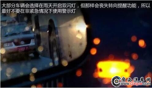 盡管無論是網絡上,還是交警都在強調,在雨霧天氣車霧燈的重要性,但很多車主還是習慣在看不清的大雨中用雙閃燈。其實這樣會有許多問題,雙閃燈在可見度很低的雨霧中穿透力并不強,有時候起到的作用有限。此外,有很多車型按下了雙閃燈后,轉向燈就用不了,這樣在可見度低的情況下轉向就有很大的危險性。而霧燈就是專門為在可見度低下的雨霧天氣使用的,如果有霧燈卻不用,那就太浪費了。