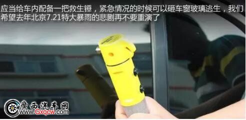 雨季常常需要涉水,所以車門的密封條也要進行檢查,防止積水進入車內。應當給車內配備一把救生錘,緊急情況的時候可以砸車窗玻璃逃生。