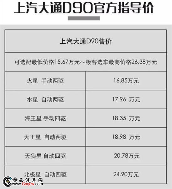 包含著100多萬粉絲關(guān)注,上億次互動(dòng)討論,4千人次實(shí)車驗(yàn)證的全尺寸智能定制互聯(lián)網(wǎng)SUV——上汽大通D90震撼上市,這次發(fā)布會(huì)公布了新車的官方售價(jià):15.67-26.38萬元,共6款官方標(biāo)準(zhǔn)車型。
