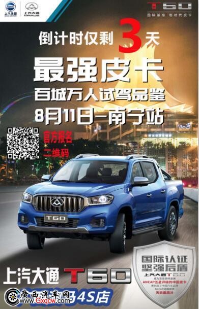 一、活動(dòng)簡介:8月11日,上汽大通T60“一起闖 一起創(chuàng)”-最強(qiáng)皮卡試駕品鑒活動(dòng)將在三源色南寧大學(xué)城試駕基地(位于南寧市西鄉(xiāng)塘區(qū)石埠收費(fèi)站以外500米處、環(huán)城高速內(nèi)側(cè)324國道南側(cè))
