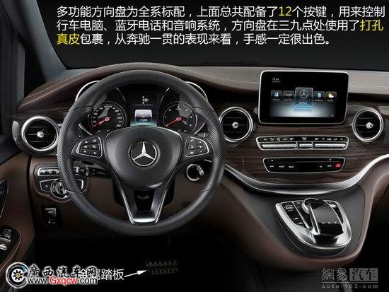 內(nèi)飾方面,你會錯把它當成了S級。其實不然,既然是奔馳家族的一員,內(nèi)飾怎能少了豪華感,全新的設(shè)計讓它逐漸往S級的方向去靠攏,讓你完全感受不到這是在開著一輛MPV。全新V級在內(nèi)飾風格上可是下了功夫的:大量真皮包裹外加以桃木裝飾點綴,全系標配的真皮包裹多功能三幅式方向盤、屏幕尺寸的可選、行車電腦配備奔馳的專用系統(tǒng)、touchpad觸摸板等,這些都是老款車型所不具備的。