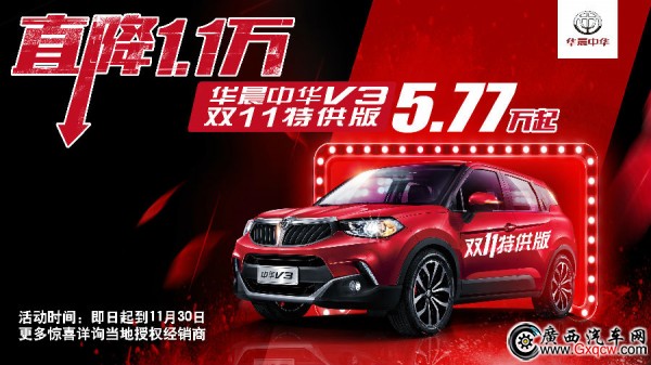 你的夢(mèng)想,中華買單!本次華晨中華V3“雙十一特供版”以超值震撼價(jià)格圓你有車夢(mèng)。詳情請(qǐng)咨詢當(dāng)?shù)亟?jīng)銷商。