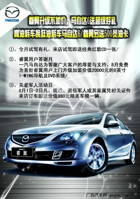 1、凡到店試駕的客戶均可獲贈由鑫廣達一汽馬自達特別為八一建軍節(jié)準備的經(jīng)典紅歌CD碟一張;