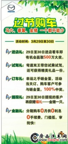 三月購車*后瘋狂,一汽馬自達廣西鑫廣達4S店三月再次給力,3月26日-31日推出節(jié)前購車無憂計劃。購車送金豬,家用轎車之王,馬自達六12.58萬起售,購“彎道王中王”睿翼送導(dǎo)航,進店賞車即有機會贏取500萬大獎,訂車再享幸運大抽獎,100%中獎!優(yōu)惠絕對震撼,價格絕對給“利”,歡迎到店賞車。