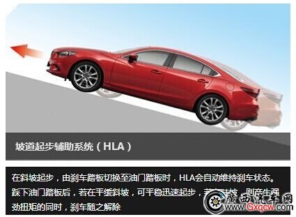 8.阿特茲的HLA上坡輔助系統(tǒng)—在斜坡起步,由剎車踏板切換至油門踏板時,HLA會自動維持剎車狀態(tài)。踩下油門踏板后,若在平緩斜坡,可平穩(wěn)迅速起步,若在陡坡,則產(chǎn)生強勁扭矩的同時,剎車隨之解除。