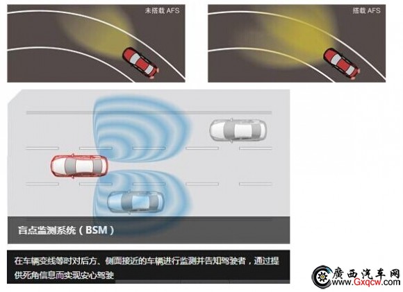 9.阿特茲擁有豪華轎車才有的前大燈智能彎道輔助照明系統(tǒng)(AFS)+盲點監(jiān)測系統(tǒng)(BSM);前大燈智能彎道輔助照明系統(tǒng)(AFS)通過感應方向盤轉(zhuǎn)向角度和車速,自動調(diào)節(jié)前大燈朝向,在夜間彎道或經(jīng)過十字路口時為行進方向提供照明,為安全行車保駕護航;