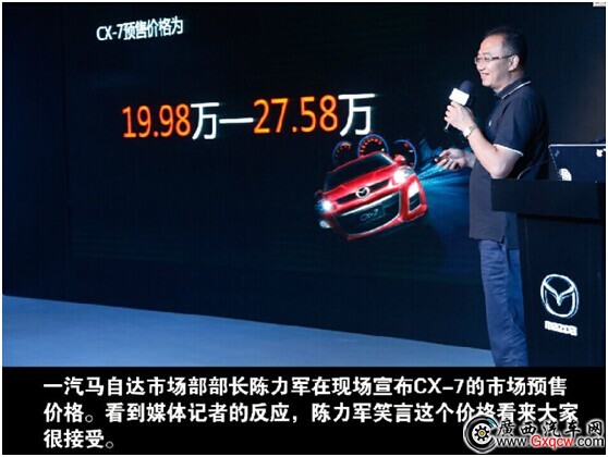 國產(chǎn)馬自達CX-7將于7月份正式上市,新車預計售價為19.98萬起,一汽馬自達廣西鑫廣達4S店現(xiàn)全面接受預定中。加上原裝進口馬自達CX-7所擁有的高品質(zhì)保障與良好的市場口碑基礎,國產(chǎn)后將在SUV市場中更具性價比優(yōu)勢,可充分滿足SUV愛好者的多種需求,無疑成為中國車市SUV領域的一個新明星。