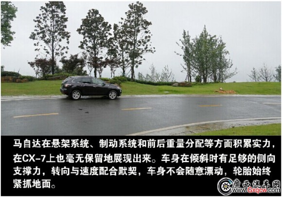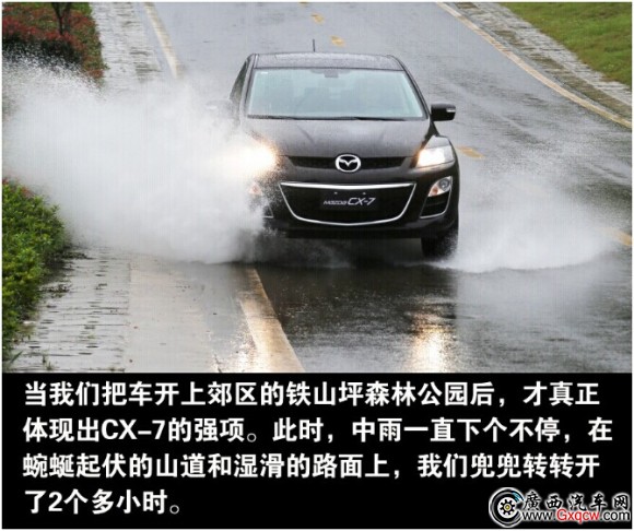 6月28日,雨中的重慶鐵山坪森林公園,山道蜿蜒曲折,道路淤水嚴重,雨一直下個不停,給我們的試駕增加了難度也增添了樂趣。一般的SUV遇到這樣的環(huán)境會頭皮發(fā)怵,但這卻是檢驗馬自達引以為豪的操控性的**時機,定位于運動性SUV的CX-7在山道上的操控表現(xiàn)帶給我們很多驚喜。