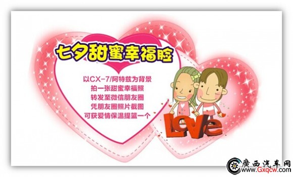 3. 約“惠”幸福禮:活動期間,現(xiàn)場到店的朋友、情侶、夫妻以馬自達CX-7或阿特茲為背景,拍一張兩人的合照,再轉發(fā)至微信朋友圈,憑朋友圈的合照截圖可獲得一份七夕禮品;