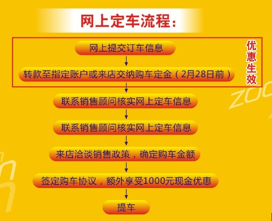 2、1元=1000元!網(wǎng)上提交定車信息后,需在2011年2月28日前通過銀行轉(zhuǎn)款或到4S店交納正常購車定金(不低于2000元),再加1元錢,方可享受額外的1000元優(yōu)惠;