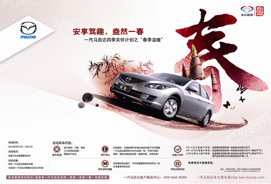 本次“安享駕趣•盎然一春”活動是一汽馬自達(dá)“四季關(guān)懷計劃”的重要部分,2012年是一汽馬自達(dá)的“服務(wù)品牌年”,“四季關(guān)懷計劃”本著“至誠無昧、至意誠心、達(dá)誠申信、赤誠相待、抱誠守真”的態(tài)度,力求讓近70萬一汽馬自達(dá)車主感受到了“全心管家式服務(wù)”的細(xì)致與溫暖。