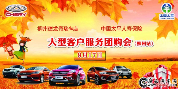 金秋9月,柳州德龍奇瑞4s店攜手中國(guó)太平人壽保險(xiǎn)-大型客戶(hù)服務(wù)團(tuán)購(gòu)會(huì)(柳州站)火熱招募中,機(jī)不可失的鉅惠!