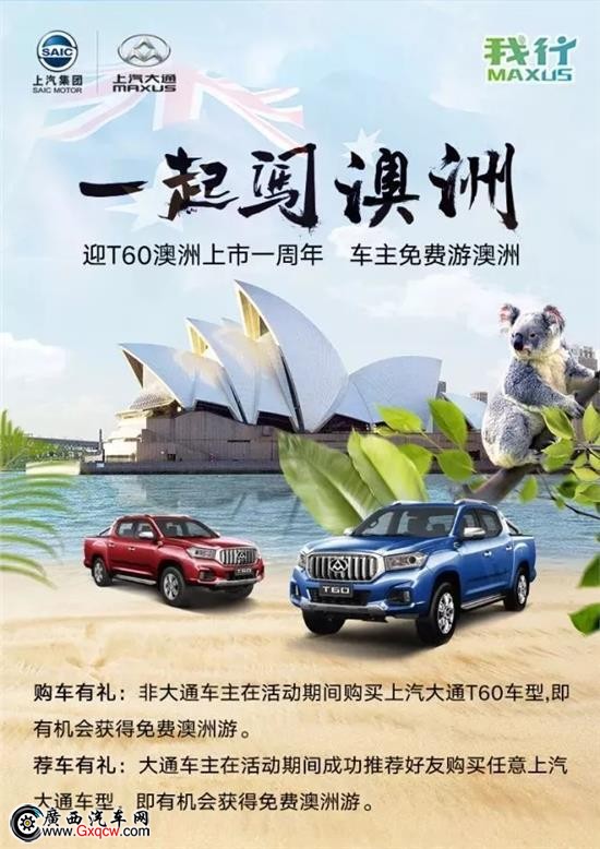 如果你是一位創(chuàng)業(yè)人士,或是一位越野玩家,如果你也想擁有一款屬于自己的皮卡,那么只要在活動(dòng)期間購(gòu)買上汽大通T60或者推薦好友成功購(gòu)買上汽大通T60 or上汽大通任意車型,都有機(jī)會(huì)獲得免費(fèi)游澳洲的機(jī)會(huì)。