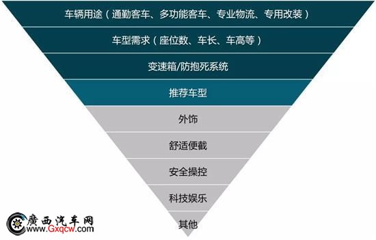 在V80的選配器中,客戶首先選擇三個(gè)問(wèn)題先進(jìn)行操作,分別是車(chē)輛用途,車(chē)型需求,變速箱/防抱死系統(tǒng)。車(chē)輛用途中有通勤客戶、多功能客車(chē)、專(zhuān)業(yè)物流、專(zhuān)用改裝等選項(xiàng)進(jìn)行選擇,車(chē)型需求中有座位數(shù)、車(chē)長(zhǎng)、車(chē)高等選項(xiàng)進(jìn)行選擇,當(dāng)這個(gè)三個(gè)基本選項(xiàng)選擇完成之后,選配器會(huì)根據(jù)客戶的選擇推薦出兩到三款車(chē)型讓客戶進(jìn)行選擇。在推薦的車(chē)型的基礎(chǔ)上,客戶再進(jìn)行外飾、舒適便捷、安全操控、科技娛樂(lè)和其他的選擇,最終選出符合自己心意的車(chē)輛。整個(gè)選配器選擇過(guò)程邏輯清晰、設(shè)計(jì)科學(xué)、容易理解、操作便捷,能夠快速的幫助客戶選擇。