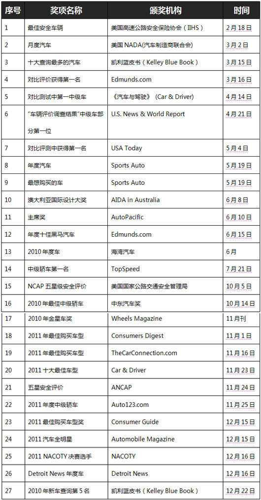 “**安全車輛”、“2010年度汽車”、“最想購(gòu)買的車”……預(yù)計(jì)今年4月8日在國(guó)內(nèi)上市第八代索納塔,2010年在海外共攬獲27項(xiàng)大獎(jiǎng),其中不乏歐美媒體年度車獎(jiǎng)及權(quán)威評(píng)測(cè)機(jī)構(gòu)的五星級(jí)安全認(rèn)定。