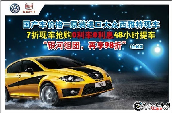 同分享,再啟程,廣匯廣西機(jī)電輝煌50年特供車型進(jìn)口大眾西雅特,用國(guó)產(chǎn)車價(jià)格就可輕松坐享原裝進(jìn)口大眾品質(zhì)。3月隆重推出“7折搶購(gòu)0利率0利息48小時(shí)提車”,“銀河組團(tuán)再享98折”鉅惠購(gòu)車方案為您開啟原裝品質(zhì)美麗新生活,挑戰(zhàn)您的購(gòu)車欲望。【廣西弘晨:0771-4922800】
