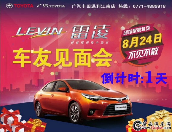 8月24日,廣汽豐田南寧迅利江南店誠邀您和您的家人參加史上最帥車型——廣汽豐田新感官領(lǐng)袖中級車雷凌上市晚會!雷凌預(yù)售價格區(qū)間10.78-15.98萬元,同時還有“返利購”、“好易購”等購車優(yōu)惠政策等著您。