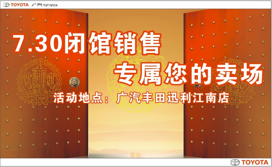 7月30日,廣汽豐田迅利江南店上午10:00-12:00將在店內(nèi)舉辦閉館銷售活動,集中店內(nèi)精英,解答你的疑問,同時針對各車型更推出六重禮,分別從價格優(yōu)惠、售后、保險均贈送豪禮,難得的機會,還等什么,趕快來分享購車的喜悅。