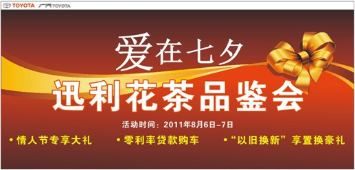 七夕,原名為乞巧節(jié)。相傳,在每年農(nóng)歷七月初七的夜晚,是天上織女與牛郎在鵲橋相會之時(shí),F(xiàn)在,我們更多的是開著自己的愛車,帶著家人,選擇涼爽的日子出去游玩,體驗(yàn)?zāi)欠菹矏偟臉啡ぁ?br /> 8月6-7日,廣汽豐田迅利江南店將在展廳內(nèi)舉辦花茶品鑒會,讓您在炎熱夏日不止可以輕松賞車,更有機(jī)會品嘗各種花茶,清涼一夏,另外凱美瑞周末半價(jià)提車,老客戶轉(zhuǎn)介紹更送千元豪禮,同時(shí)針對各車型更推出八重禮,難得的機(jī)會,還等什么,趕快來分享購車的喜悅。