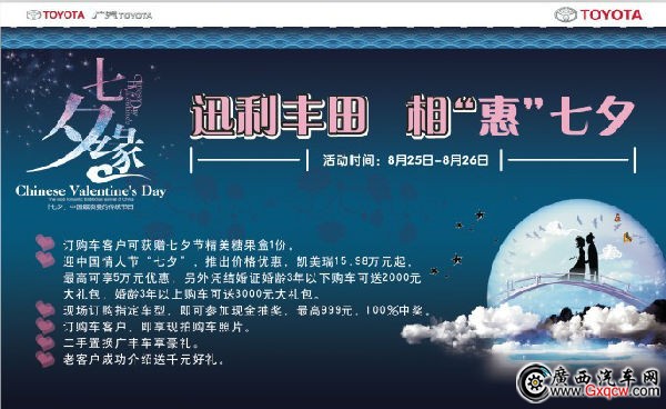 本周迎來了中國傳統(tǒng)情人節(jié)“七夕”,廣汽豐田迅利店向南寧市民推出甜蜜價,凱美瑞全系15.98萬元起,部分車型*高可享5萬元優(yōu)惠,漢蘭達享受15000元優(yōu)惠,逸致、雅力士也全市*低價銷售。另外憑結婚證婚齡3年以下購車可送2000元大禮包,婚齡3年以上購車可送3000元大禮包。凡是8月25-26日到店訂購車的客戶,均可贈送甜蜜巧克力、水晶之戀一份。廣汽豐田迅利店與您共同見證您的甜蜜愛情,現(xiàn)場為您提供現(xiàn)拍紀念照一份,將他(她)的照片放在身邊,記在心里,hold 住你的愛。