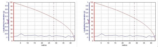 注:橫坐標(biāo)為時(shí)間,單位為S(秒)圖中紅色曲線表示車輛速度對(duì)應(yīng)左側(cè)縱坐標(biāo),單位為:km/h(公里/小時(shí))。藍(lán)色色曲線表示車輛加速度對(duì)應(yīng)左側(cè)藍(lán)色縱坐標(biāo),單位為:G(重力加速度)