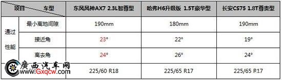 為適應(yīng)復雜路況行駛,三款車型都有意調(diào)高了底盤,AX7和CS75擁有190mm的最小離地間隙,超越了同級別SUV產(chǎn)品。在接近角和離去角的對比上,長安CS75不占優(yōu)勢。而東風風神和哈弗H6的表現(xiàn)很強悍。23°的接近角和24°的離去角,使東風風神AX7從容應(yīng)對面陡坡。