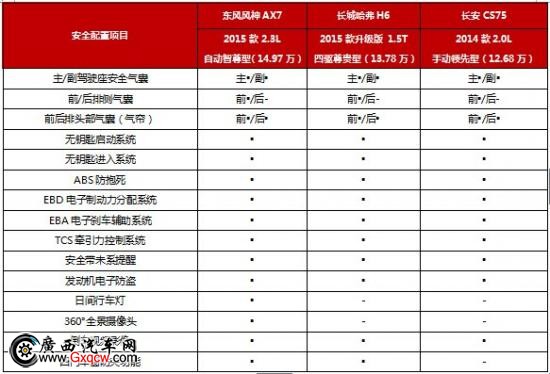 在所選的同級(jí)別車(chē)型中,表格給出的結(jié)果很直觀,三款車(chē)的安全配置均十分豐富、全面。東風(fēng)風(fēng)神AX7是**全系標(biāo)配ESC、安全頭枕,**擁有360°全景影像的車(chē)型,這些絕對(duì)是安全的“加分項(xiàng)”。