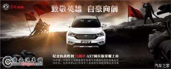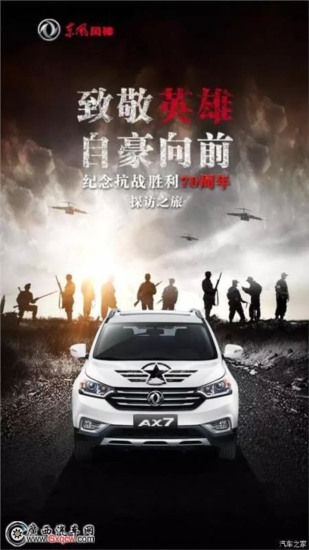 2015年,站在抗戰(zhàn)勝利70周年的歷史節(jié)點(diǎn),肩負(fù)民族汽車工業(yè)振興的重要使命,志在喚醒中國品牌、國人的自信自強(qiáng),東風(fēng)風(fēng)神以央企國家隊(duì)的身份和軍工品質(zhì)為依托,吹響“向英雄致敬”的集結(jié)號(hào),帶領(lǐng)由AX7閱兵版車隊(duì)組成的鋼鐵紅流重走抗戰(zhàn)路,致敬英雄,自豪向前!東風(fēng)風(fēng)神期待您的參與,更期待與您攜手?jǐn)y手踐行“汽車夢(mèng)”,推動(dòng)中國由“汽車制造大國”向“汽車強(qiáng)國”轉(zhuǎn)變,打造“中國制造”新名片!