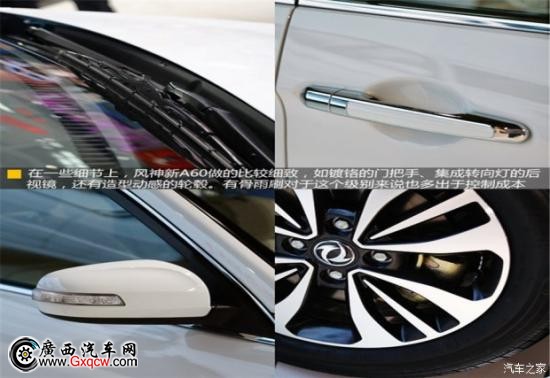 在一些細(xì)節(jié)上,風(fēng)神新A60做的比較細(xì)致,如鍍鉻的門把手、集成轉(zhuǎn)向燈的后視鏡,還有造型動(dòng)感的輪轂。有骨雨刷對(duì)于這個(gè)級(jí)別來說也多出于控制成本。尾部新A60的變化不是很大,但尾燈上倒車燈白色條狀的上移,與鍍鉻橫條形成一整條分隔帶使得車尾變得更加規(guī)整。