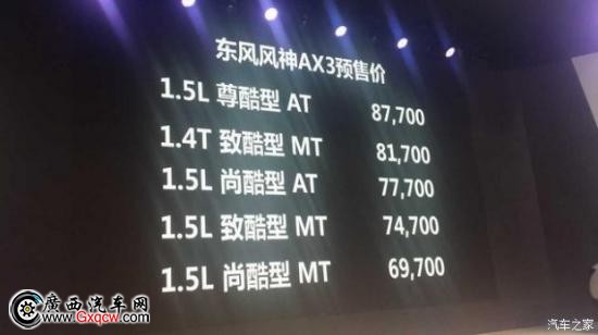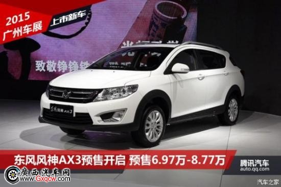 2015年11月20日,東風(fēng)風(fēng)神AX3在廣州國際車展正式公布預(yù)售價,預(yù)售6.97萬-8.77萬元。