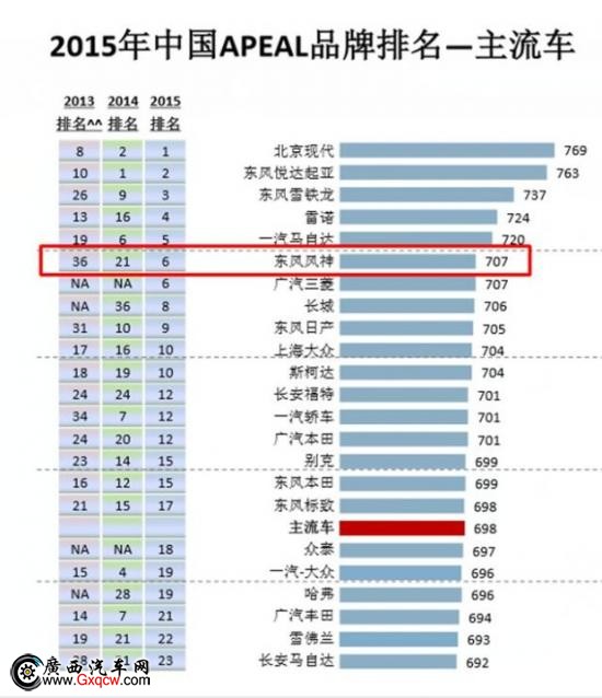 汽車魅力質(zhì)量指數(shù)研究,根據(jù)新車車主的評分來評測車主在2-6個月?lián)碥嚻趦?nèi)對于車輛性能和設(shè)計的滿意度,研究涉及車輛的10個類別(車身外觀、車身內(nèi)裝、置物和空間、音響/娛樂設(shè)備/導(dǎo)航系統(tǒng)、座椅、空調(diào)系統(tǒng)、駕駛性能、發(fā)動機及變速系統(tǒng)、視野與行車安全以及燃油經(jīng)濟性)的82個要素。該報告已經(jīng)連續(xù)發(fā)布13年,是行業(yè)內(nèi)權(quán)威的測評報告。根據(jù)2015年APEAL報告,東風(fēng)風(fēng)神品牌的整體分值為707分,與日系、德系等合資品牌處于同一水平。更為重要的是,與部分汽車品牌魅力質(zhì)量指數(shù)連續(xù)幾年排名下跌或起伏不定相比,東風(fēng)風(fēng)神品牌的魅力質(zhì)量指數(shù)則是飛躍式上揚,四年內(nèi)提升了35位。