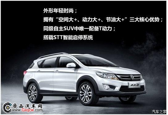 “大 SUV”AX3上市,售價(jià)6.97-8.77萬(wàn)元。上市之后,東風(fēng)風(fēng)神AX3將與“同門(mén)學(xué)長(zhǎng)”AX7并肩攜手出擊火爆的SUV市場(chǎng)。俗話說(shuō)得好,“打虎親兄弟,上陣父子兵”,AX3與AX7的組合,必將為東風(fēng)風(fēng)神2016年的銷(xiāo)量打開(kāi)新局面。